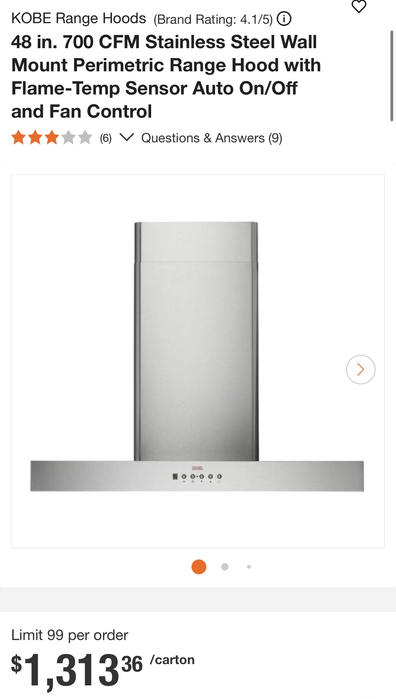 Bidding for the KOBE Range Hoods (Brand Rating: 4.1/5) O 48 in. 700 CFM Stainless Steel Wall Mount Perimetric Range Hood with Flame-Temp Sensor Auto On/Off and Fan Control starts at $50. Please bid in increments of $10.
